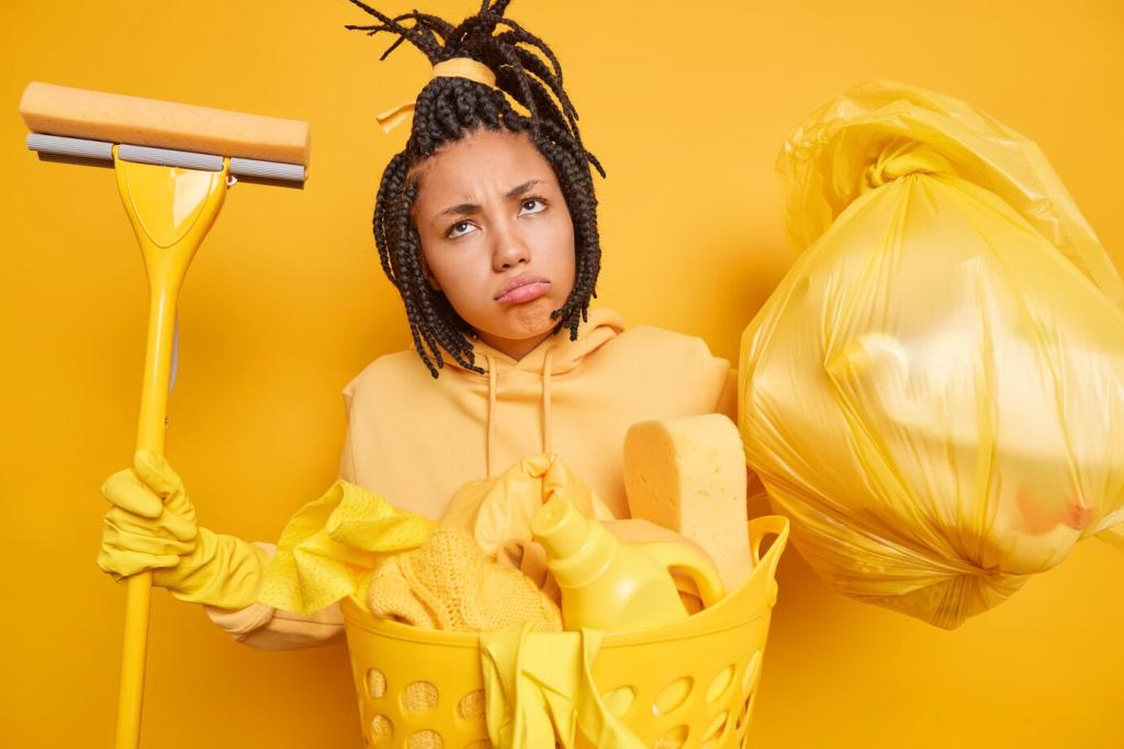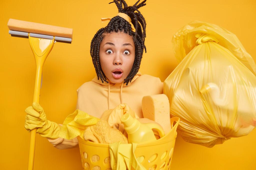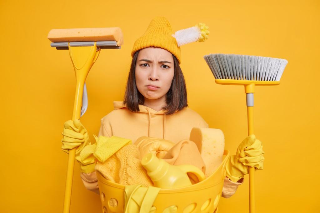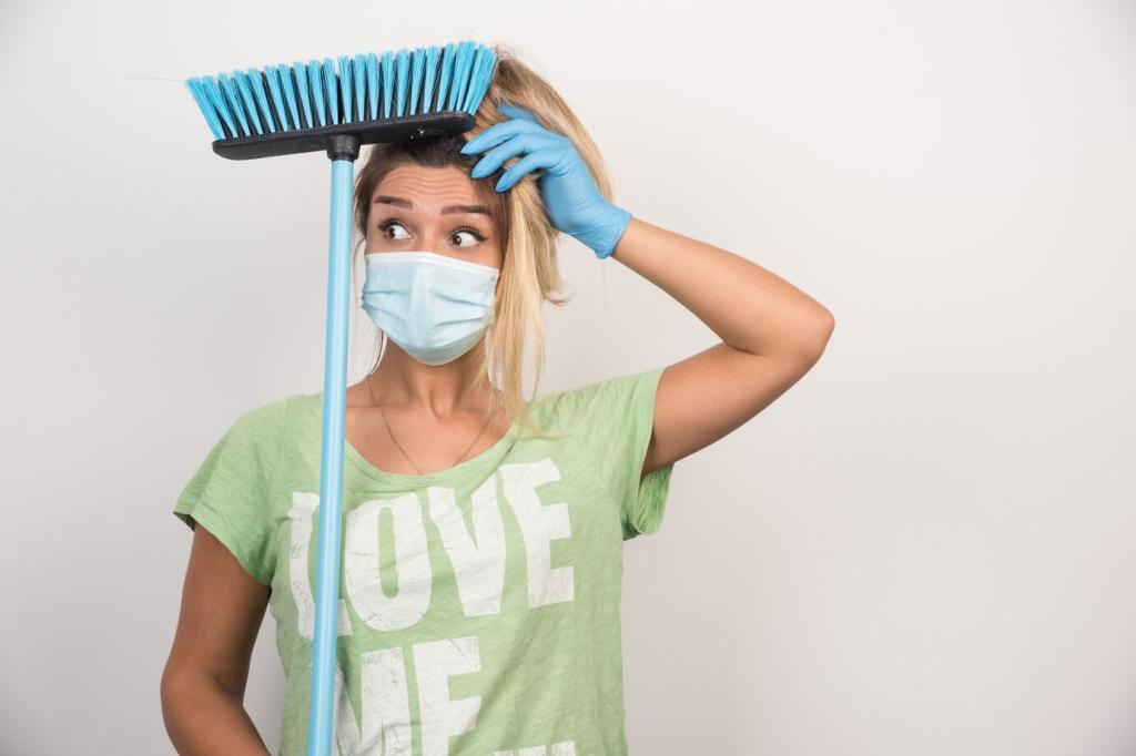 Ein Set farbcodierter Tücher verhindert Kreuzkontamination und beschleunigt Abläufe. Fülle eine Sprühflasche mit mildem Reiniger, damit du nicht ständig Produkte suchst. Berichte, welche Farbcodes bei dir funktionieren, und wie oft du deine Tücher wäschst.